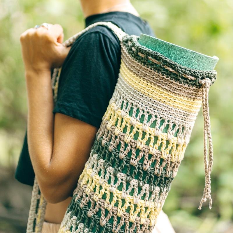 Funda para esterilla de yoga tejida a crochet. Con su estilo étnico encajará a la perfección con el ambiente creado en tus clases. Además, la puedes llevar a juego con el Cubrebotellas Freezer.