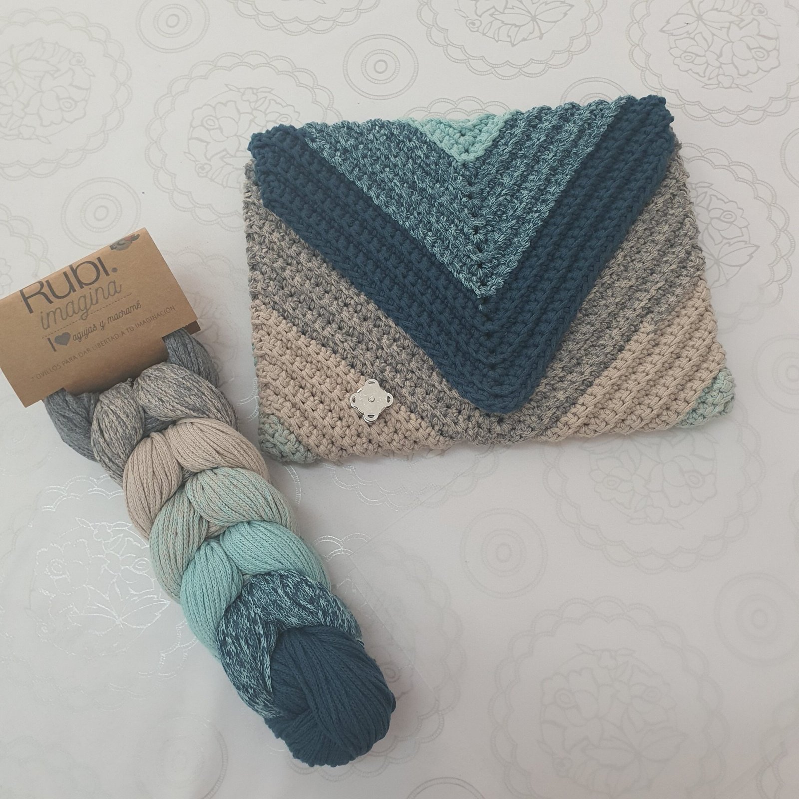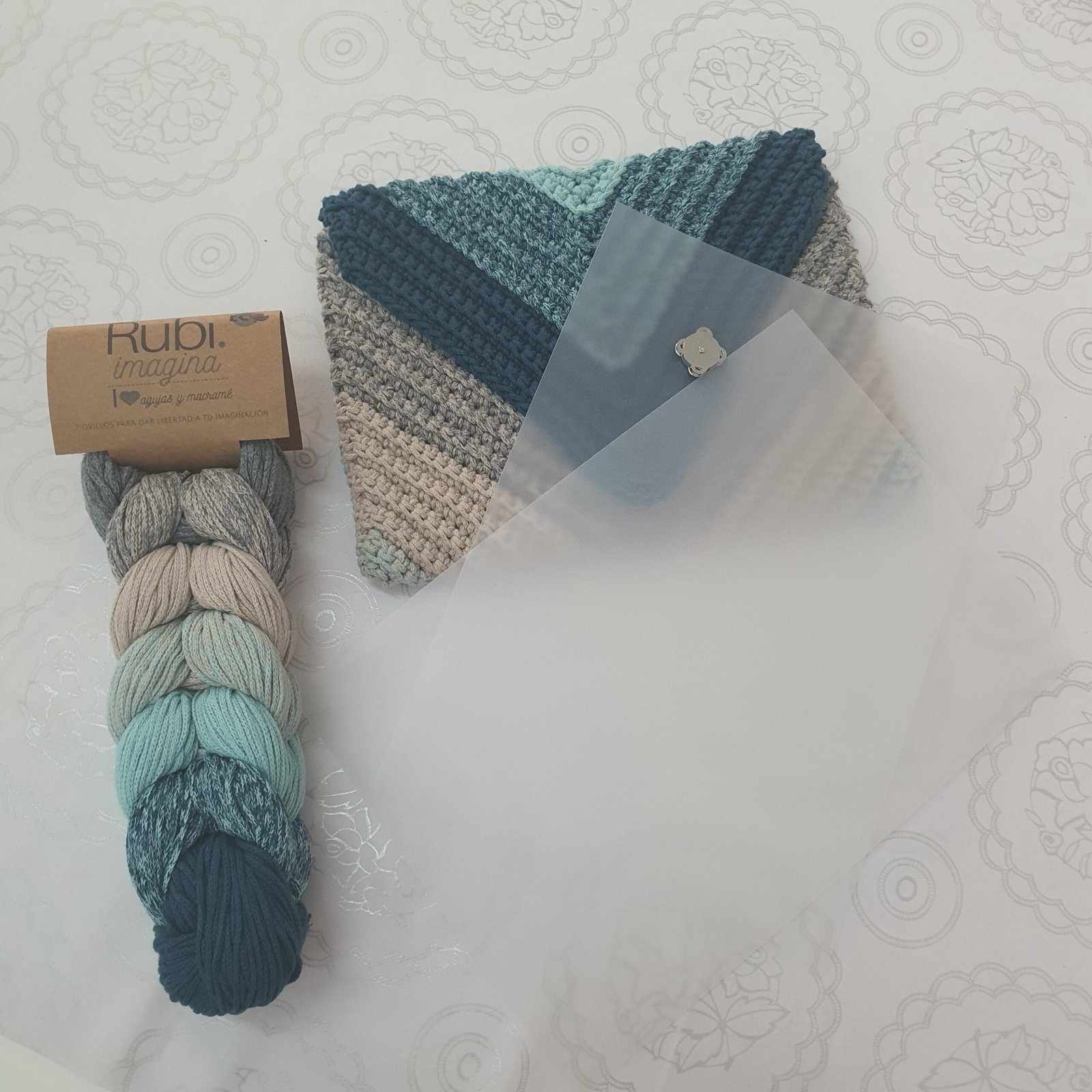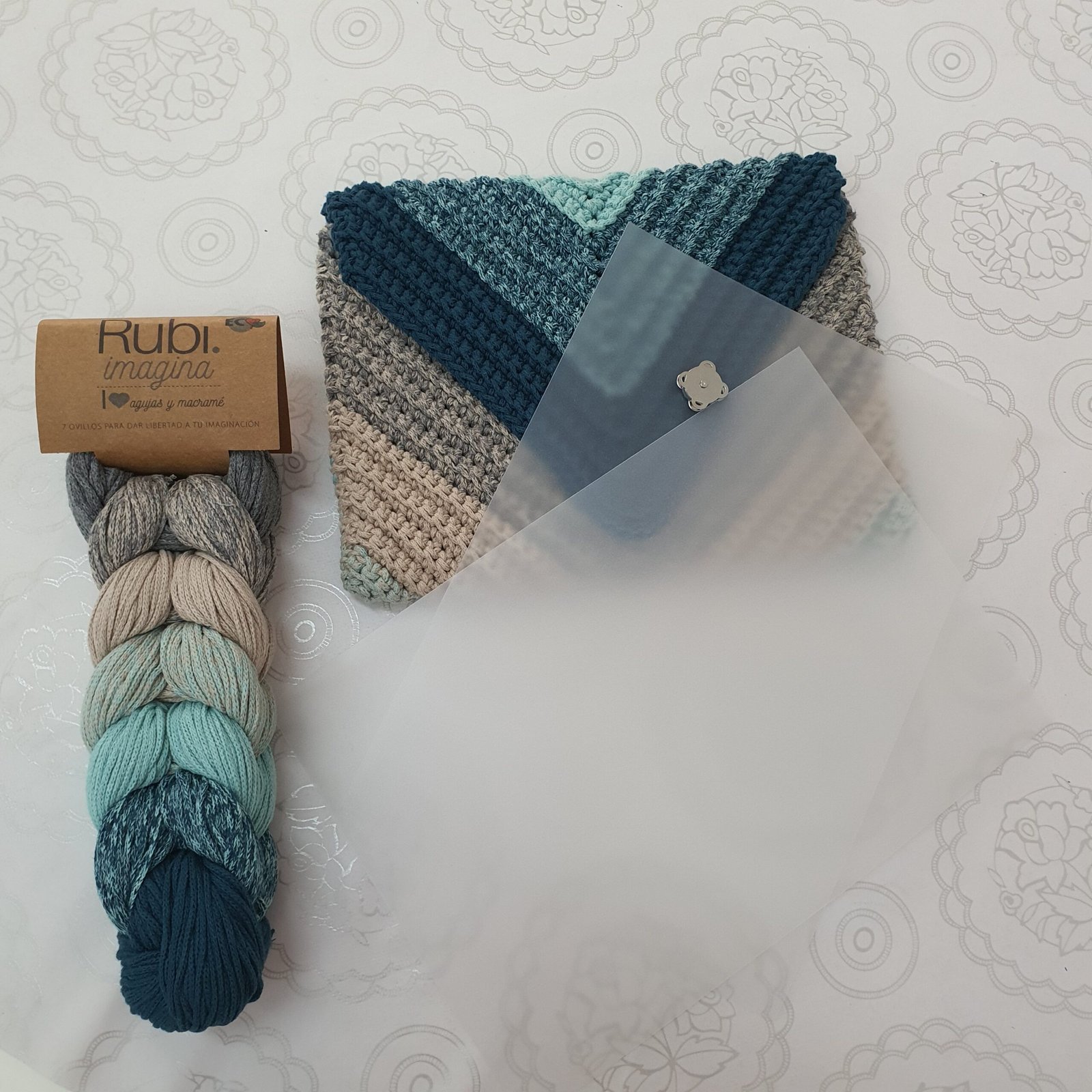 El kit incluye todo lo necesario para crear el bolso, la malla Rubi imagina, dos láminas de acetato, un broche de imán y un patrón detallado que guía en el proceso de tejido.