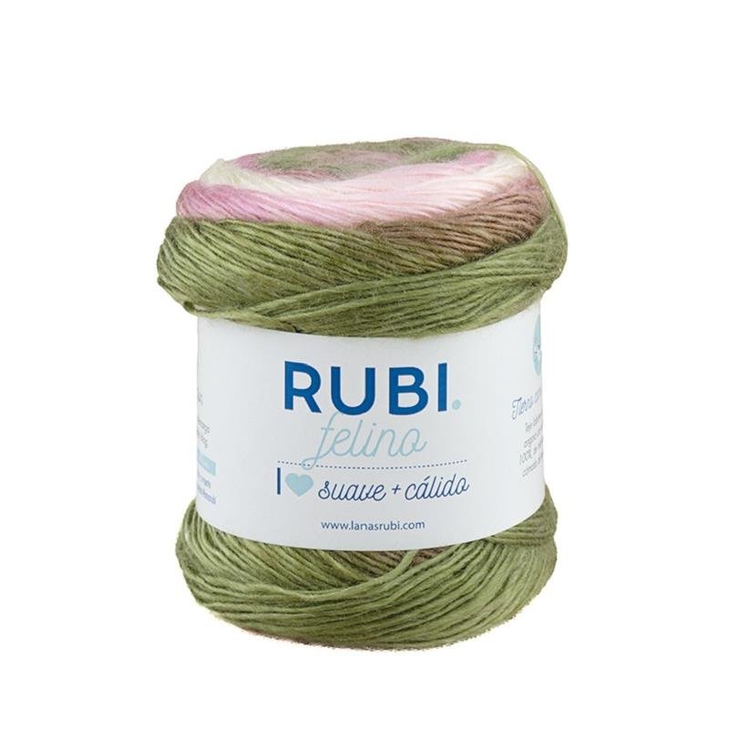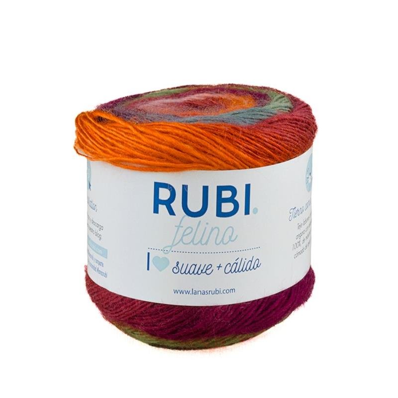 Rubí Felino es un hilo de acrílico premium que se caracteriza por su suavidad y calidez, proporcionando un efecto angora y rayas difuminadas en las prendas tejidas. Es versátil y apto para tejedoras avanzadas, con una atractiva combinación de colores en cada ovillo, lo que añade un toque otoñal a los proyectos. Su fácil manejo lo hace cómodo para trabajar.